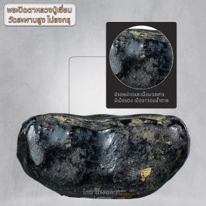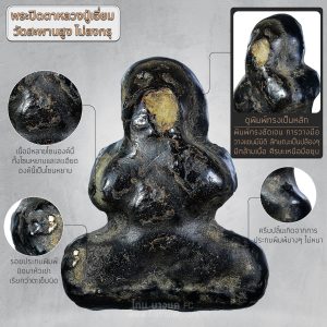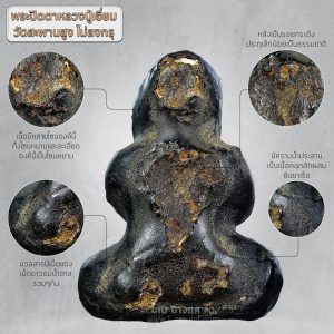 เนื้อมีหลายโซน มีทั้งโซนหยาบและละเอียด องค์นี้เป็นโซนหยาบ, มวลสารมีเม็ดแดง เม็ดขาวอมน้ำตาล รวมๆ กัน หลังเป็นรอยกระด้งปะทุเล็กน้อยเป็นธรรมชาติ, มีคราบน้ำประสานเป็นเนื้อคลุกลักผสมชันยาเรือ