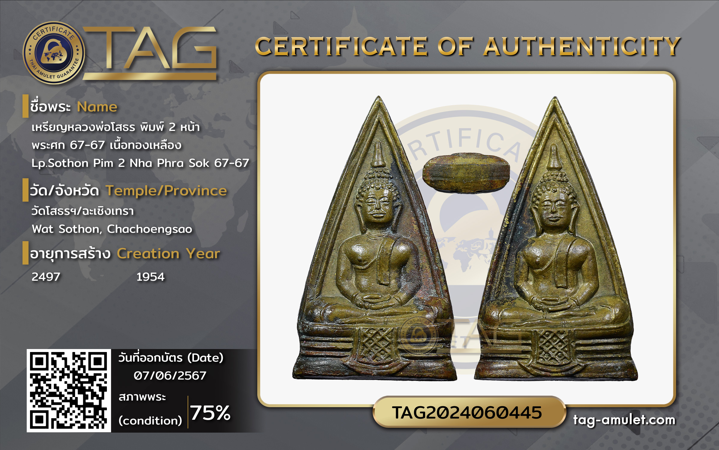 เหรียญหลวงพ่อโสธร พิมพ์ 2 หน้า พระศก 67-67 เนื้อทองเหลือง วัดโสธรฯ จังหวัดฉะเชิงเทรา ปี 2497
