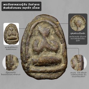 พระปิดตาเนื้อผงคลุกรัก ของท่านเนื้อละเอียดสีออกน้ำตาลแบบเนื้อกะลาของหลวงพ่อแก้ว แห่งวัดเครือวัลย์ บางองค์จะจุ่มรัก และบางองค์จะปิดทองคำเปลว มีอยู่หลายพิมพ์ พุทธศิลป์นั้นเป็นพระปิดตาเศียรโล้น มือทั้งสองข้าง ปิดหน้าปิดตา โดยไม่เห็นรายละเอียดของนิ้วทั้งสิบ มีหูทั้งซ้ายและขวา แข้งนั้นเป็นแข้งรวมกันใหญ่ เราเรียกว่าแข้งหมอน มีซุ้มขอบพระเป็นเส้นโดยรอบ ขอบนอกซุ้มครอบองค์พระเป็นขอบที่มีส่วนเกินโดยรอบเท่า ๆ กัน และเป็นขอบพระและหลังพระที่ปั้นขึ้นเท่านั้น