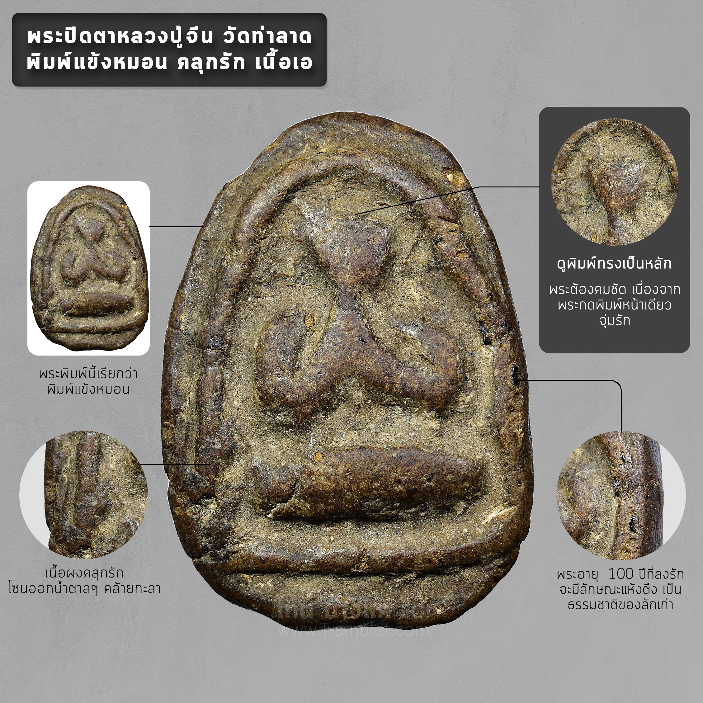 พระปิดตาหลวงปู่จีน พิมพ์แข้งหมอน คลุกรัก เนื้อเอ ดูพิมพ์ทรงเป็นหลัก พระต้องคมชัด เนื่องจากเป็นพระกดพิมพ์หน้าเดียว จุ่มรัก พระอายุ 100 ปีที่ลงรัก จะมีลักษณะแห้งตึง เป็นธรมมชาติของรักเก่า เนื้อผงคลุกรักโซนออกน้ำตาลๆ คล้ายกะลา