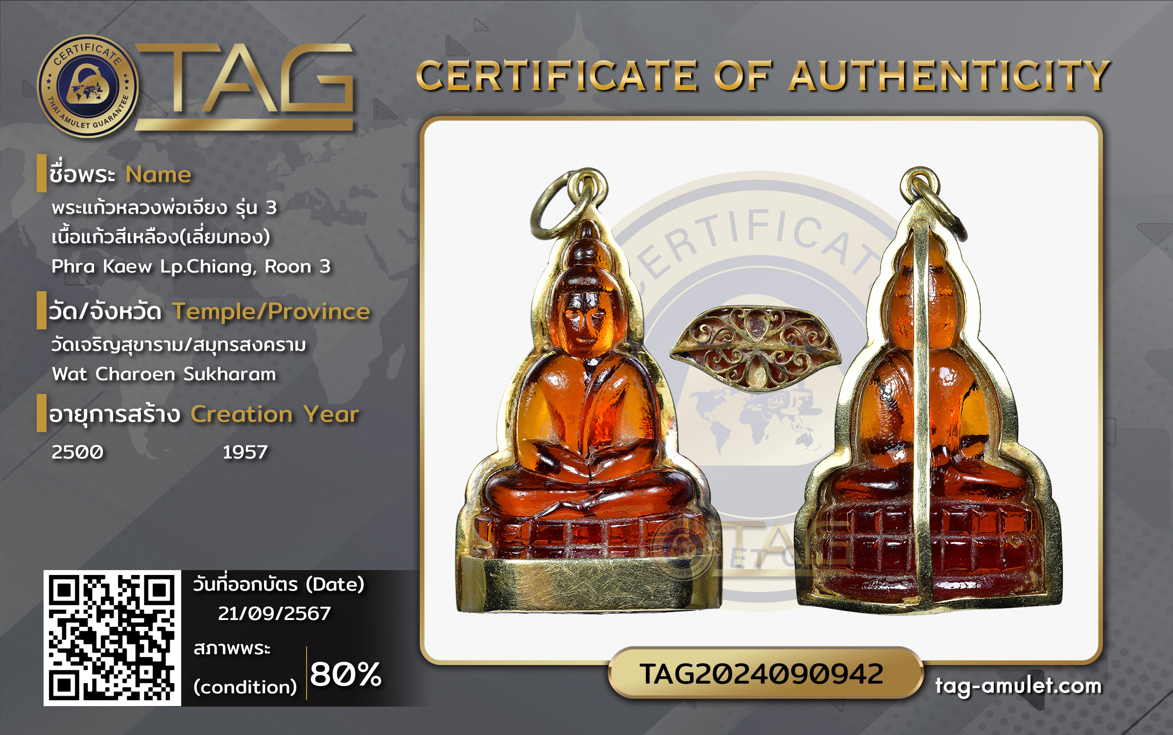 พระแก้วหลวงพ่อเจียง รุ่น 3 เนื้อแก้วสีเหลือง(เลี่ยมทอง) วัดเจริญสุขาราม จังหวัดสมุทรสงคราม