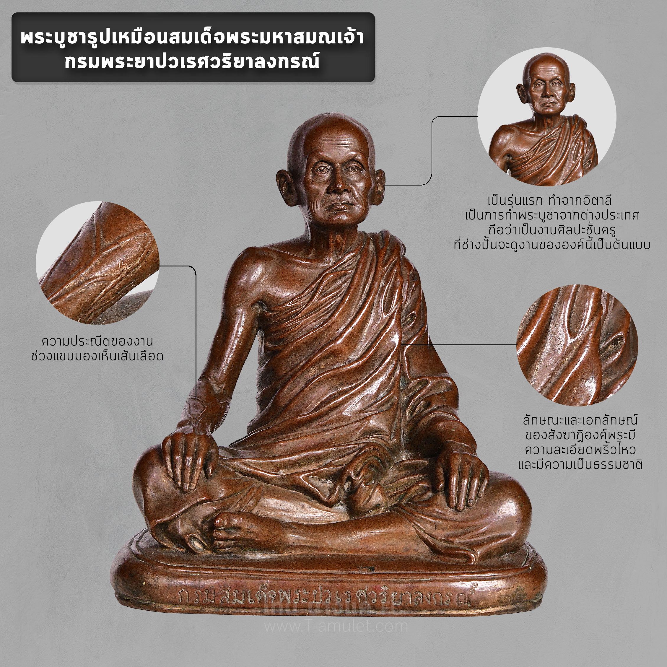 พระบูชารูปเหมือนสมเด็จพระมหาสมณเจ้ากรมพระยาปวเรศวริยาลงกรณ์เป็นรุ่นแรกที่ทำจากประเทศอิตาลี ถือว่าเป็นงานศิลปะชั้นครู ช่างปั้นจะดูงานขององค์นี้เป็นต้นแบบ ความประณีตของงานช่วงแขนมองเห็นเส้นเลือดชัดเจน ลักษณะและเอกลักษณ์ของสังฆาฏิองค์พระมีความละเอียดพริ้วไหวและมีความเป็นธรรมชาติ