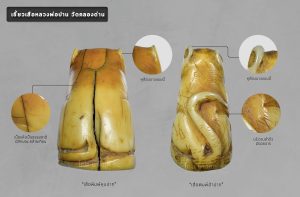 ด้านหน้า มีจารยันต์ตัว อุ ที่บริเวณหน้าขา เล็บมีลักษณะเล็กจิก
