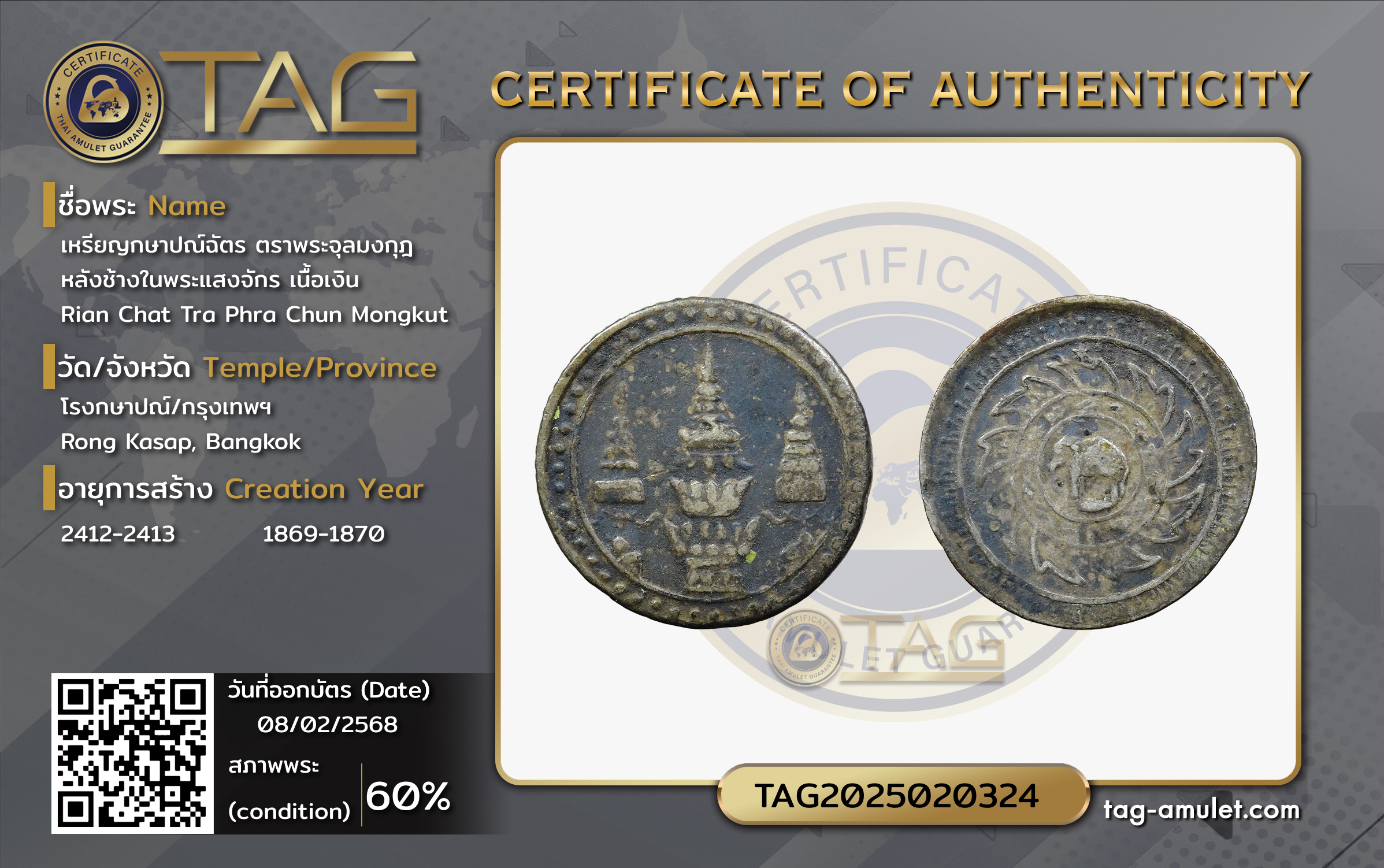 เหรียญกษาปณ์ฉัตร ตราพระจุลมงกุฎ หลังช้างในพระแสงจักร เนื้อเงิน โรงกษาปณ์ กรุงเทพฯ ปี 2412-2413
