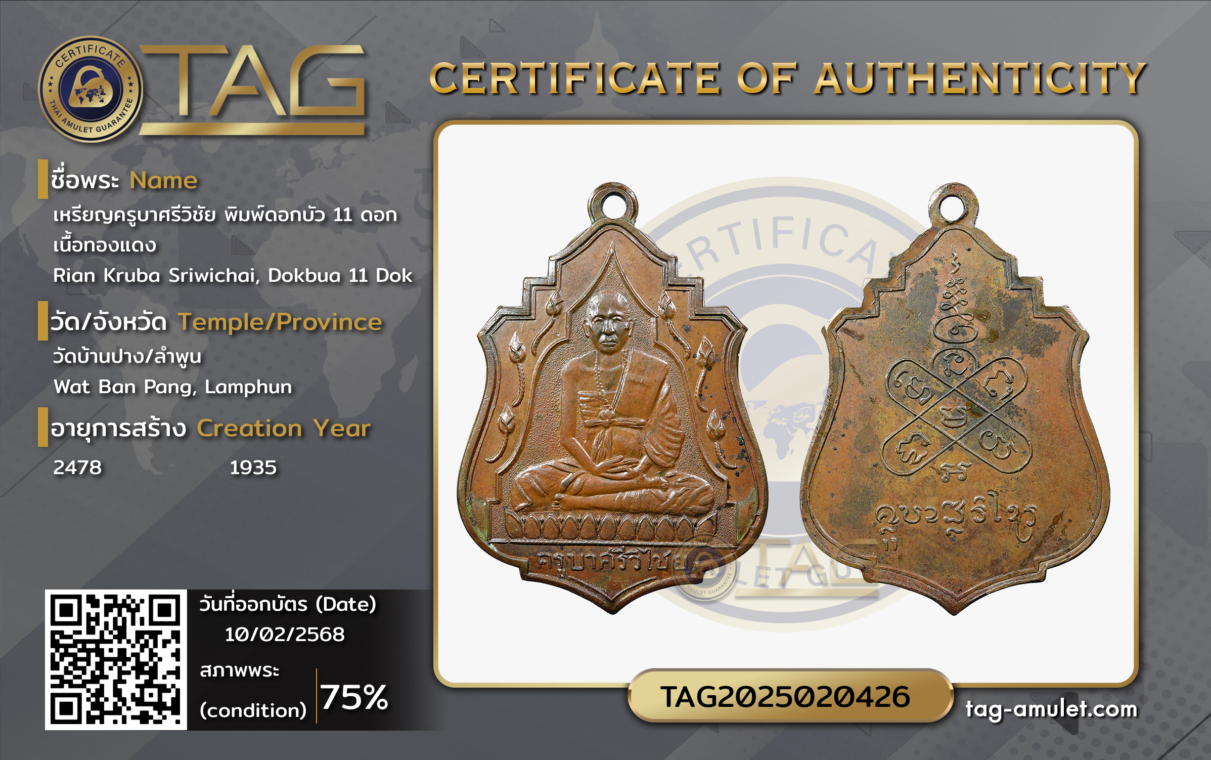 เหรียญครูบาศรีวิชัยบัว 11 ดอก สร้างเมื่อประมาณปี 2478 จัดว่าเป็นเหรียญเดียวที่สร้างขึ้นทันสมัยท่านมีชีวิตอยู่ ก่อนท่านมรณภาพในปี 2482 เป็นเหรียญที่คณะราษฎร์ โดยจอมพลแปลก พิบูลสงคราม เป็นผู้สร้างถวายในโอกาสสร้างสะพาน “ศรีวิชัย” ข้ามแม่น้ำปิงระหว่าง ต.ริมปิง จ.ลำพูนและ อ.หนองตอง จ.เชียงใหม่