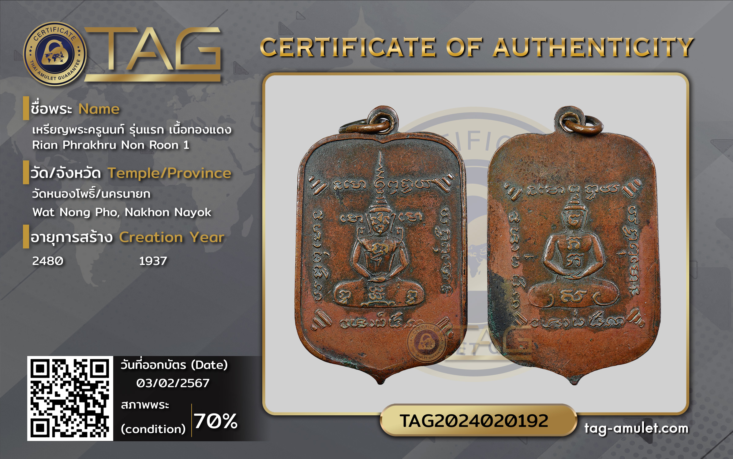 เหรียญพระครูนนท์ รุ่นแรก เนื้อทองแดง วัดหนองโพธิ์ จังหวัดนครนายก ปี 2480