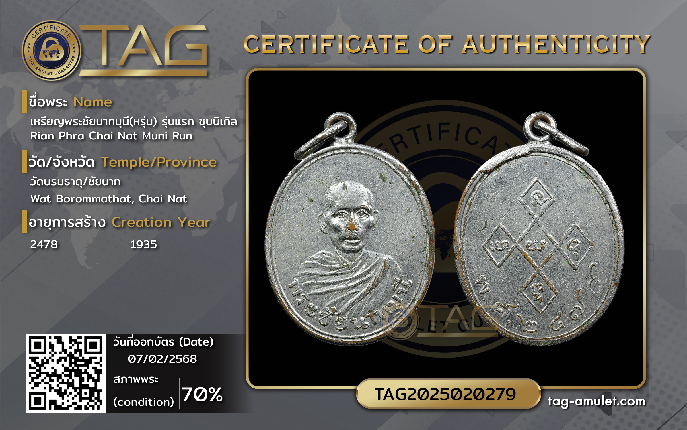 เหรียญพระชัยนาทมุนี (หรุ่น) รุ่นแรก ชุบนิเกิล วัดบรมธาตุ จ.ชัยนาท ปี 2478