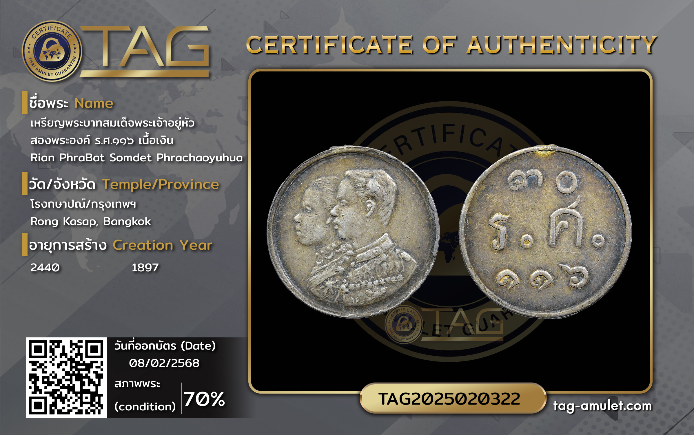 เหรียญพระบาทสมเด็จพระเจ้าอยู่หัว สองพระองค์ ร.ศ.๑๑๖ เนื้อเงิน โรงกษาปณ์ กรุงเทพฯ ปี 2440