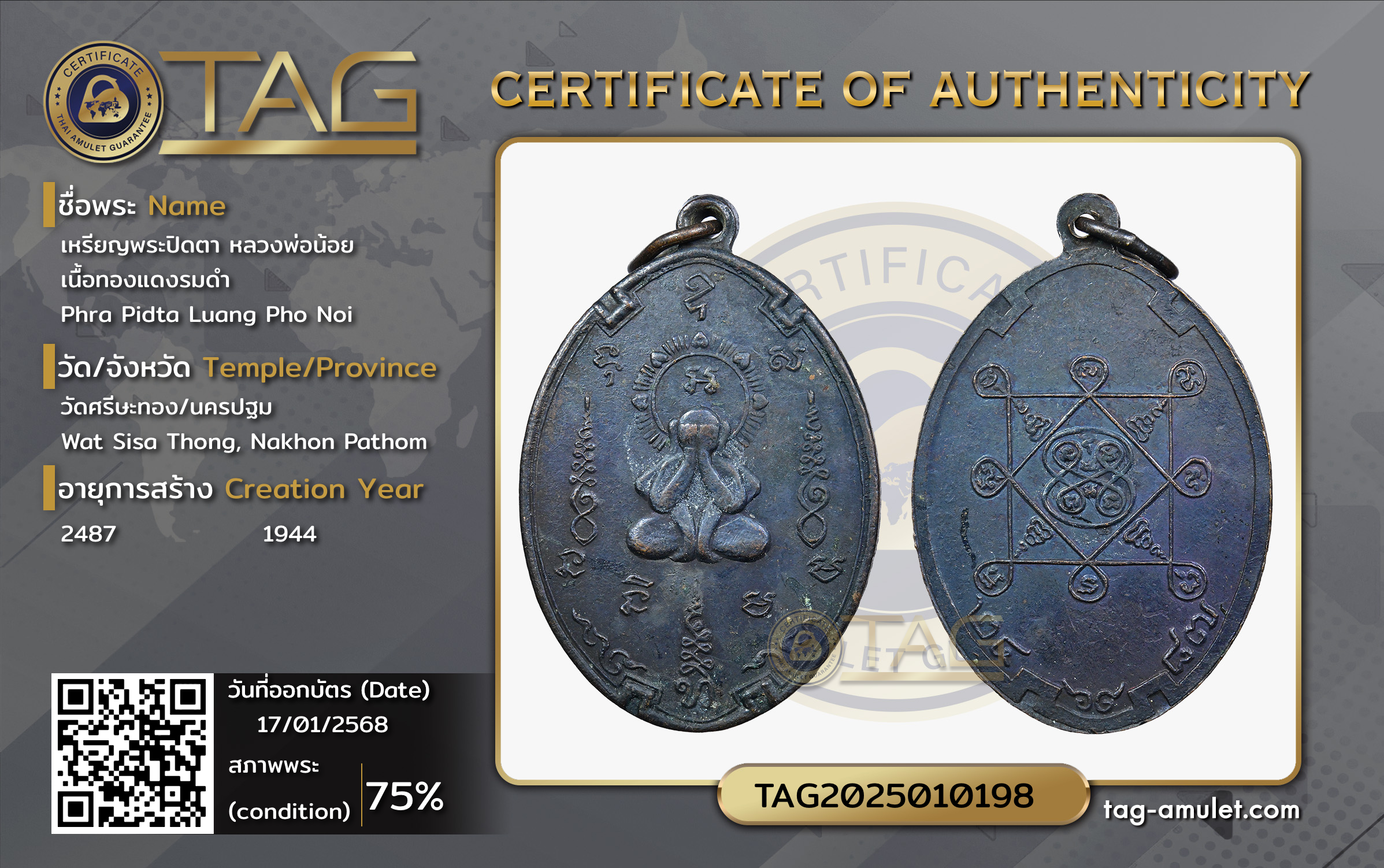 เหรียญพระปิดตา หลวงพ่อน้อย เนื้อทองแดงรมดำ วัดศรีษะทอง จ.นครปฐม ปี 2487