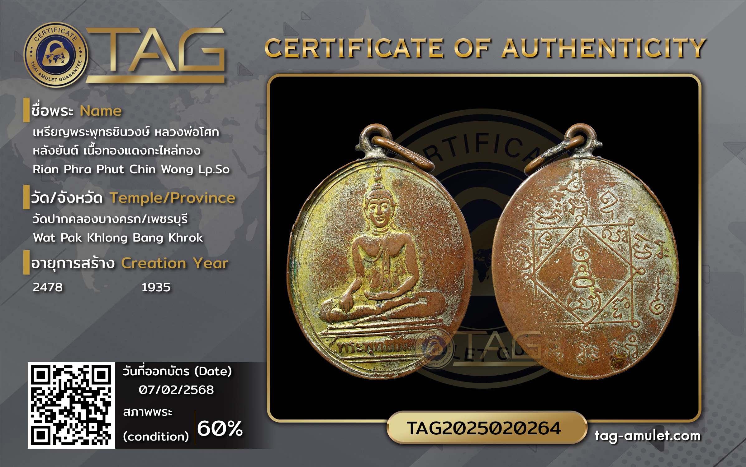 เหรียญพระพุทธชินวงษ์ หลวงพ่อโศก หลังยันต์ เนื้อทองแดงกะไหล่ทอง วัดปากคลองบางครก จ.เพชรบุรี ปี 2478