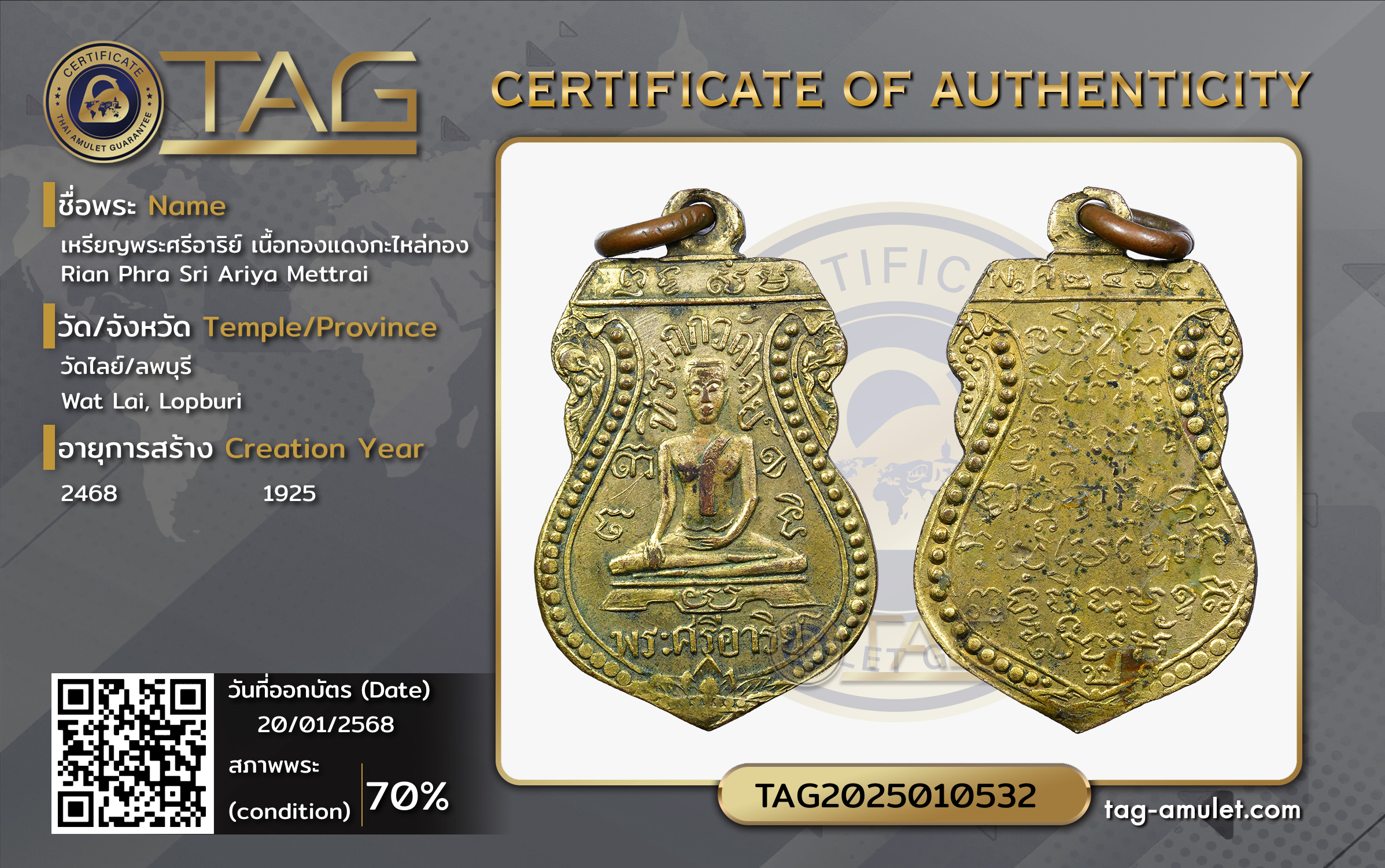 เหรียญพระศรีอาริย์ เนื้อทองแดงกะไหล่ทอง วัดไลย์ จ.ลพบุรี ปี 2468