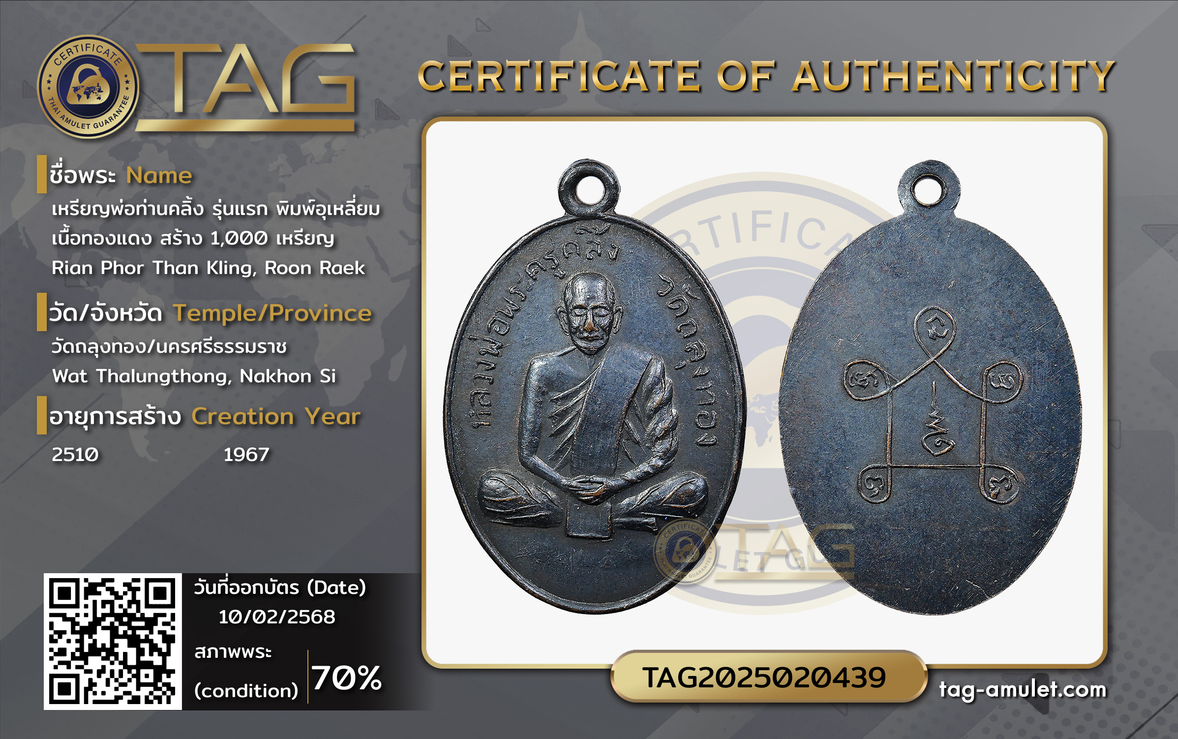 เหรียญรุ่นแรกของพ่อท่าน คลิ้ง สร้างเมื่อปี พ.ศ. 2510 ประมาณ 1,000 เหรียญ พ่อท่านปลุกเสกอยู่นานจึงนำออกแจกในงานสรงน้ำขณะสิริอายุครบ 82 ปีเมื่อปี 2511 หมดภายในวันเดียว และสร้างซ้ำอีกครั้งเมื่อปี พ.ศ. 2513 โดยใช้บล็อกหน้าตัวเดียวกับครั้งแรก แต่มีการแกะบล็อกหลังขึ้นมาใหม่ เพราะมีคนต้องการมาก ท่านจึงอนุญาตให้สร้างอีก 2,000 เหรียญ และนำแจกฟรีทั้งหมดในงานสรงน้ำพ่อท่าน ขณะสิริอายุครบ 85 ปี เหรียญเป็นเนื้อทองแดงทั้งหมด มีแบบรมดำและแบบผิวไฟ จะเป็นรูปไข่ขนาดเล็ก ด้านหน้า เป็นรูปเหมือนของพ่อท่านนั่งเต็มองค์ โดยมีอักษร เขียนว่า หลวงพ่อพระครู คลิ้ง วัดถลุงทองและด้านหลังเป็นยันต์ห้า จะอ่านว่า นะ โม พุท ธา ยะ พระพุทธเจ้าห้าพระองค์ ซึ่ง ยันต์ห้า นี้จะดีครอบจักรวาล ข้างในจะมียันต์อีกตัวคือยันต์อุนาโลม ซึ่งมีคุณวิเศษครอบจักรวาลเช่นกัน เท่าที่พบเจอส่วนใหญ่จะเจอแต่สภาพสึกๆ เนื่องด้วยว่าคนในพื้นที่นิยมหามาใช้ติดตัวกันมานานแล้ว เพราะด้วยชื่อเสียงและมั่นใจในพุทธคุณของพ่อท่าน เหรียญรุ่นแรกของพ่อท่าน คลิ้ง เด่นในด้านเมตตา ค้าขาย แคล้วคลาด ปลอดภัย มหาอุตคงกระพัน