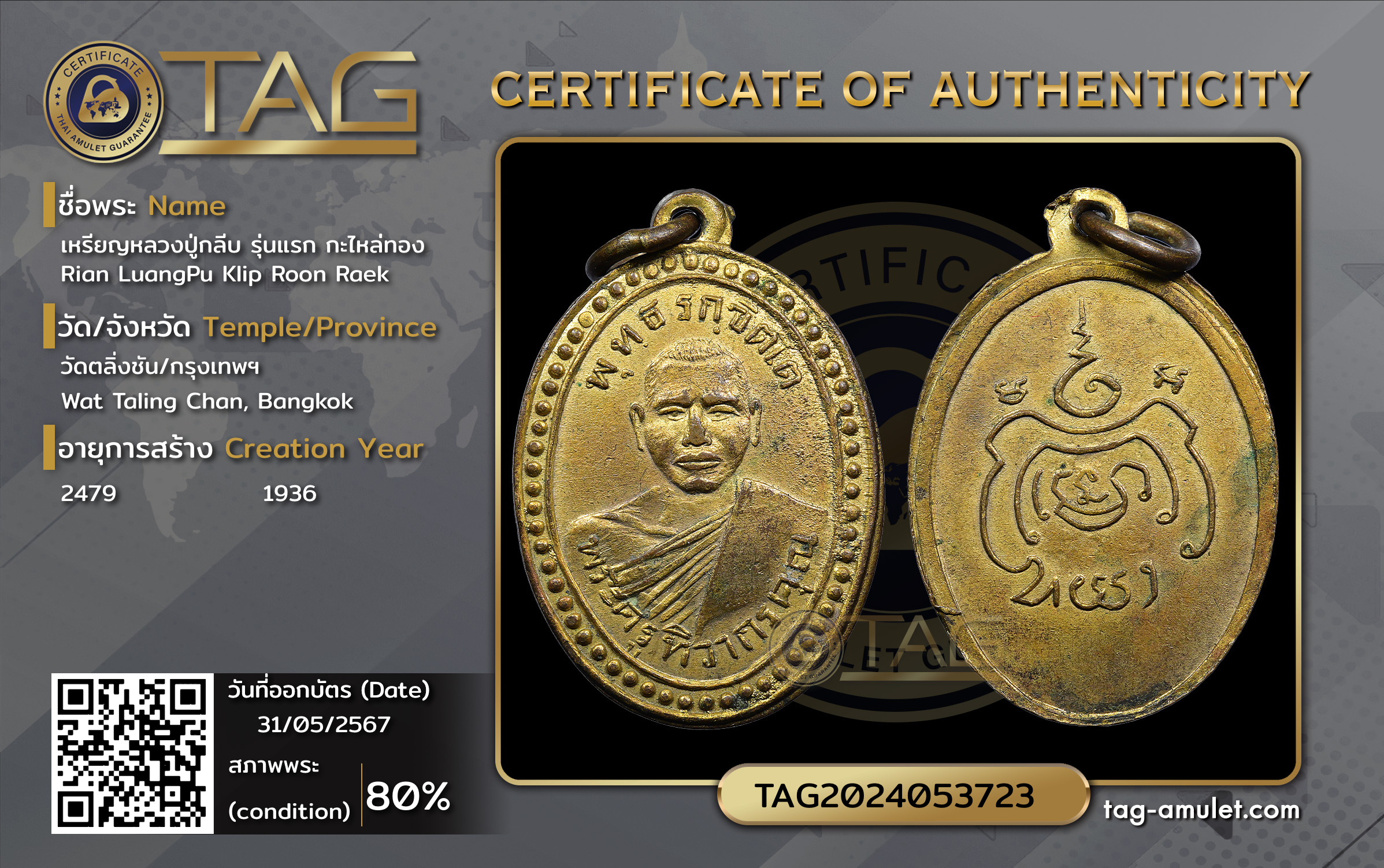 เหรียญหลวงปู่กลีบ รุ่นแรก กะไหล่ทอง วัดตลิ่งชัน กรุงเทพฯ ปี 2479