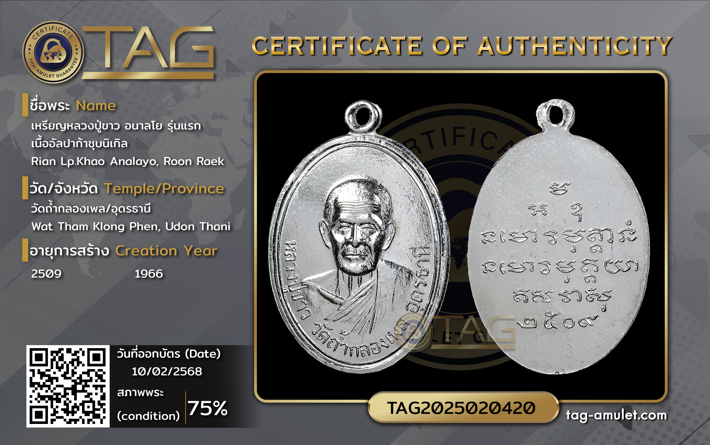Thank you for reading this post, don't forget to subscribe!พุทธลักษณะด้านหน้าเป็นเหรียญรูปไข่ มีหูห่วง จัดสร้างเป็นเนื้อทองแดงกะไหล่เงิน ด้านหน้าเหรียญเป็นรูปเหมือนของหลวงปู่ขาว อนาลโย มีอักษรนูนโค้งตามขอบด้านล่าง เขียนคำว่า “หลวงปู่ขาว วัดถ้ำกลองเพล อุดรธานี” (ซึ่งในขณะนั้นจ.หนองบัวลำภูยังเป็นอำเภอหนึ่งของจ.อุดรธานี) ส่วนพุทธลักษณะด้านหลังเป็นอักขระคาถาโบราณ ด้านล่างอักษรนูนเขียนตัวเลขไทยปีที่สร้าง “2509” นับเป็นสุดยอดเหรียญที่บรรดานักสะสมวัตถุมงคลต้องการและเสาะแสวงหาอีกเหรียญหนึ่ง