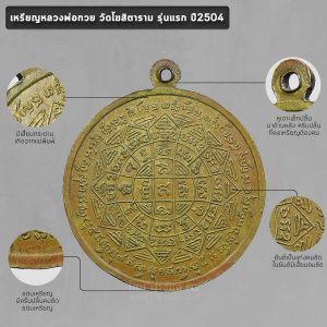 ในด้านของพุทธลักษณะนั้น ทางด้านหน้าเป็นรูปเหมือนของหลวงพ่อกวยนั่งอยู่เต็มองค์ ในอิริยาบถที่นั่งขัดสมาธิ ในส่วนของด้านบนเหนือศรีษะหลวงพ่อนั้น มีข้อความที่สลักเอาไว้เป็นคำว่า “หลวงพ่อกวย วัดโฆสิตาราม” และในส่วนทางด้านหลังของเหรียญนั้นได้มีการบรรจุพระมหายันต์ที่เรียกกันว่า “ยันมงกุฎพระพุทธเจ้า” ที่มีความศักดิ์สิทธิ์เป็นอย่างมาก และผูกหัวใจรพระคาถาพระไตรปิฎก และหัวใจพระคาถาไตรรัตน์ นอกจากนี้ยังมี “ยันต์ตรีนิสิงห์เห” ที่มีการคั่นอยู่โดยรอบ แต่เหรียญที่เป็นเนื้ออัลปาก้าจะมีความเป็นเนื้อโลหะแบบแข็ง จึงทำให้เหรียญที่ถูกปั๊มออกมานั้น ไม่มีความคมชัดเท่ากับเนื้อทองเหลืองเท่าไรนัก แต่ก็หายาก ราคาสูง เป็นที่ต้องการมากในเหล่าบรรดานักสะสมเช่นกัน นอกจากนี้เหรียญทุกเหรียญจะมีทั้งรอยจาร และไม่มีรอยจารสำหรับเหรียญที่มีรอยจารนั้น จะหาได้ยากมากกว่าเหรียญที่ไม่มีรอยจาน ซึ่งในยุคนั้นหลวงพ่อได้ให้ทำบุญเหรียญละ 20 บาท แต่ในปัจจุบันนี้ราคามีการขยับตัวขึ้นมาก ถึงหลักล้านและหลายล้านกันเลยทีเดียว