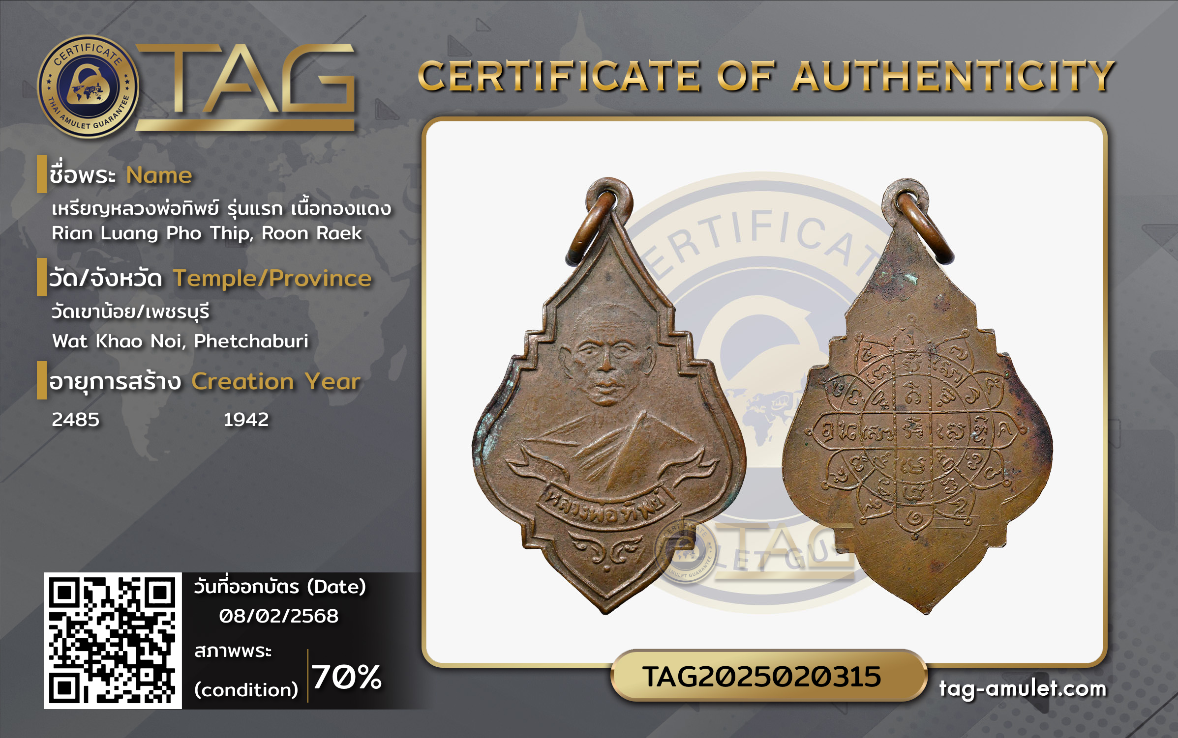 Thank you for reading this post, don't forget to subscribe! เหรียญหลวงพ่อทิพย์ รุ่นแรก เนื้อทองแดง ปี 2485 วัดเขาน้อย จังหวัดเพชรบุรี