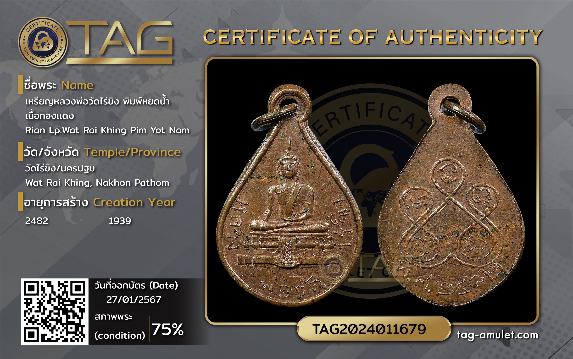 เหรียญหลวงพ่อวัดไร่ขิง พิมพ์หยดน้ำ เนื้อทองแดง วัดไร่ขิง จังหวัดนครปฐม ปี 2482