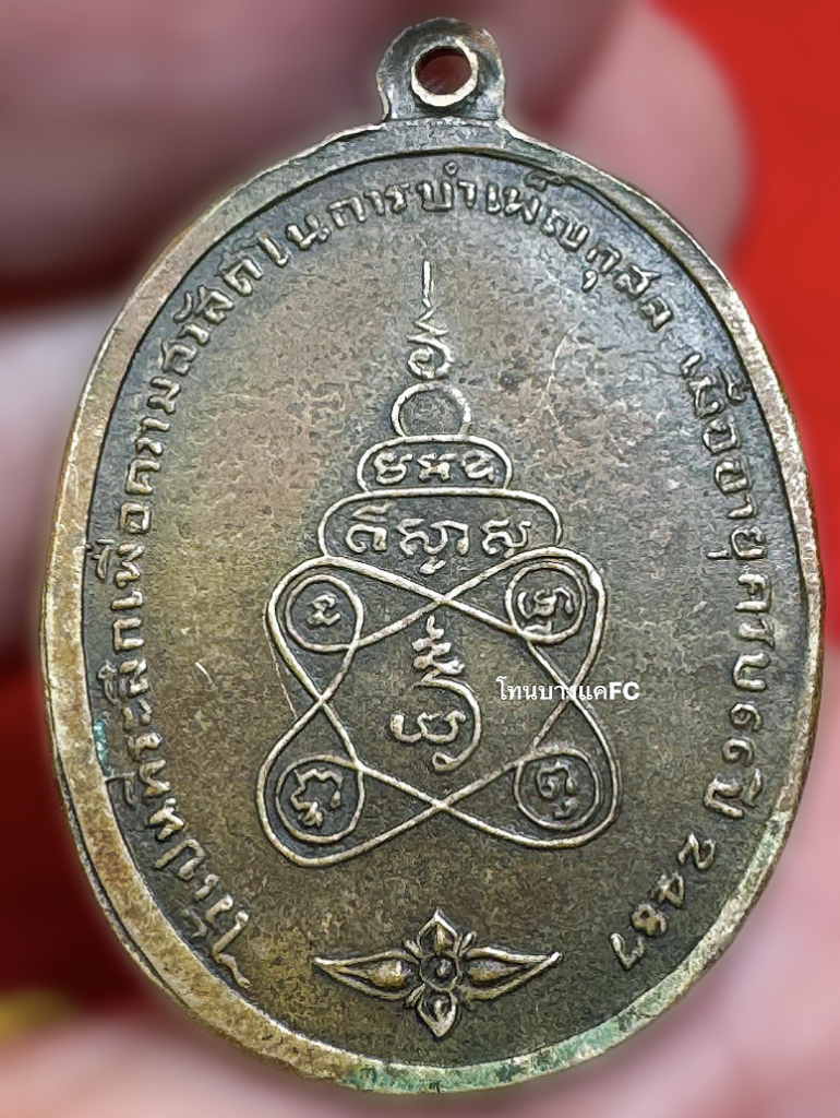 ด้านหลัง เป็นยันต์มงคลประจำสายอาจารย์วัน ล้อมด้วยอักขระขอมและลายกนก