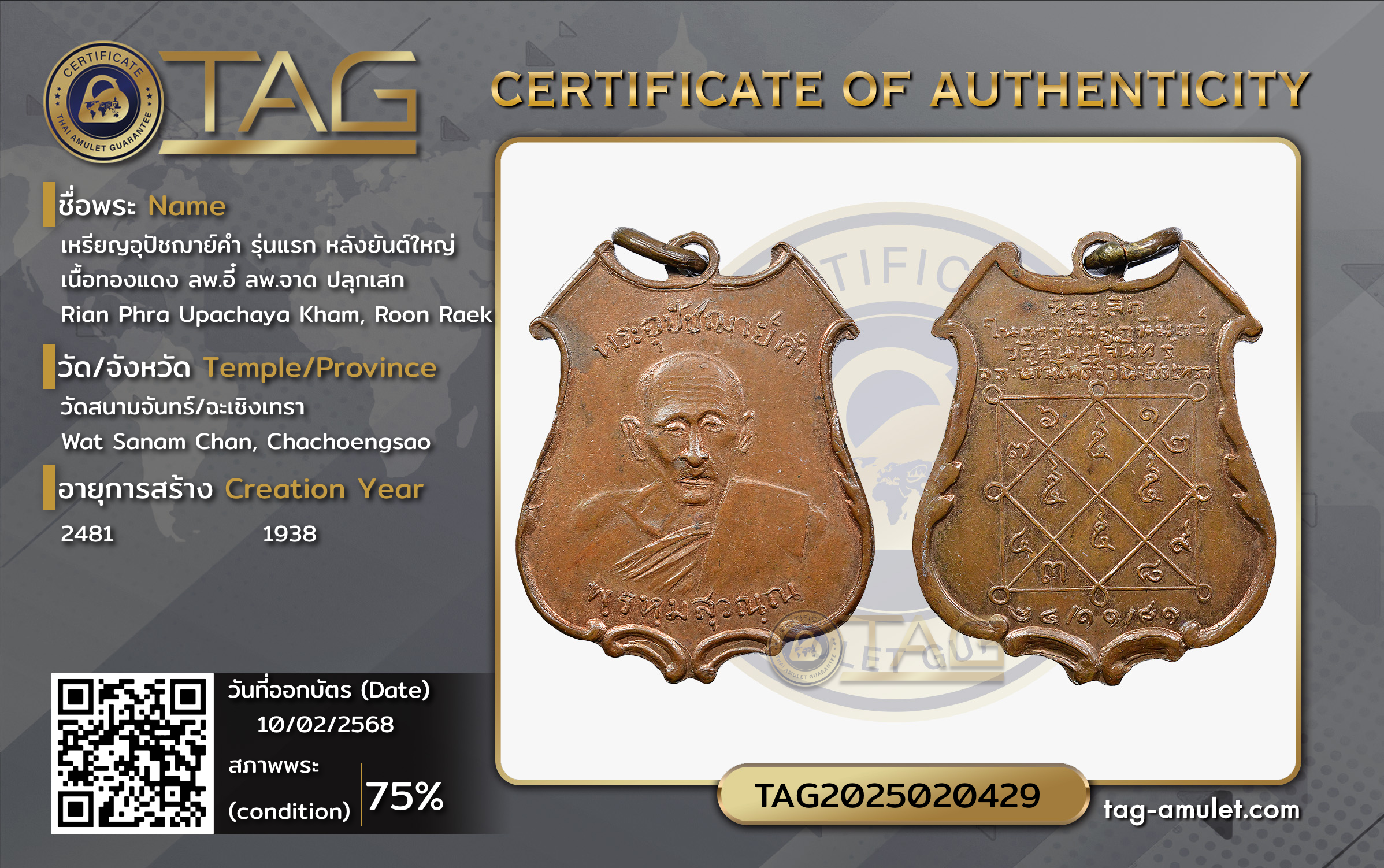 เหรียญอุปัชฌาย์คำ รุ่นแรก หลังยันต์ใหญ่ เนื้อทองแดง ลพ.อี๋ ลพ.จาด ปลุกเสก วัดสนามจันทร์ จ.ฉะเชิงเทรา ปี 2481