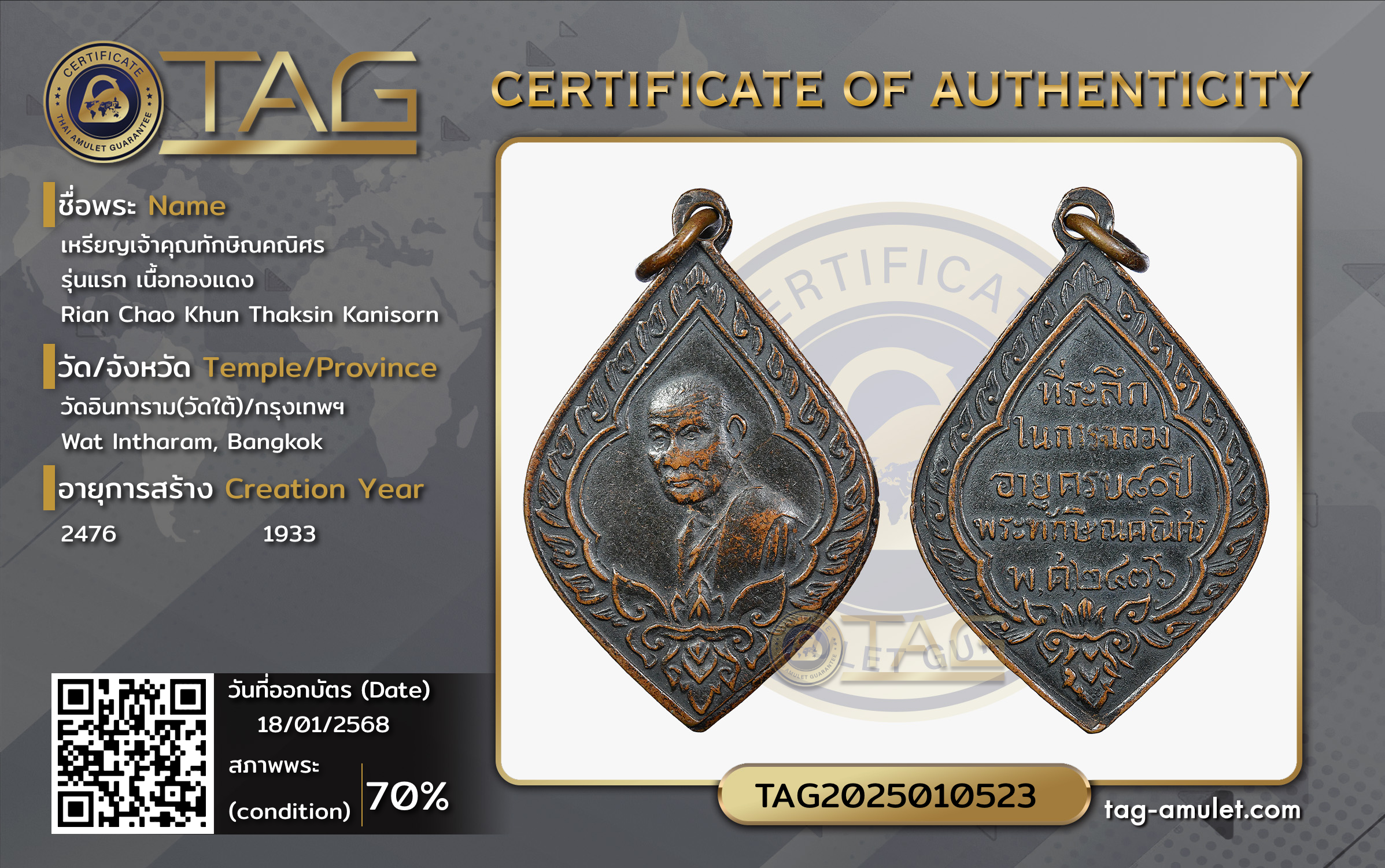 เหรียญเจ้าคุณทักษิณคณิศร(สาย) วัดอินทราราม(ใต้) ตลาดพลู กทม ปี 2476 รุ่นแรก สร้างในวาระอายุครบ 80 ปี พ.ศ.2476 ท่านเป็นผู้สร้างพระเพชรหลีกวัดใต้ อันโด่งดังหลวงพ่อสายเป็นศิษย์สมเด็จพระวันรัต(แดง) เช่นเดียวกันกับสมเด็จพระสังฆราชแพแต่อ่อนอาวุโสกว่า ท่านมีความสัมพันธ์ใกล้ชิดกับ ลพ.คง วัดบางกระพร้อม ด้วยเหตุเป็นคนสมุทรสงครามด้วยกันจึงไปมาหาสู่กันเป็นนิตย์วัตถุมงคลสุดวิเศษที่ผู้คนทั่วไปใฝ่หาคือ พระเพชรหลีก ที่ท่านสร้างจากเมล็ดข้าวเปลือกตั้งแต่ ปี 2470ส่วนเหรียญที่ท่านสร้างมีสองเหรียญ คือ เหรียญแรก ปี 2476 เพื่อเป็นที่ระลึกอายุครบ 80 ปี และเหรียญที่สองสร้างเมื่อ ปี 2482 ลพ.สาย เกิดเมื่อปี พ.ศ.2397 มรภาพในปี พ.ศ.2484 รวมสิริอายุได้ 88 ปี