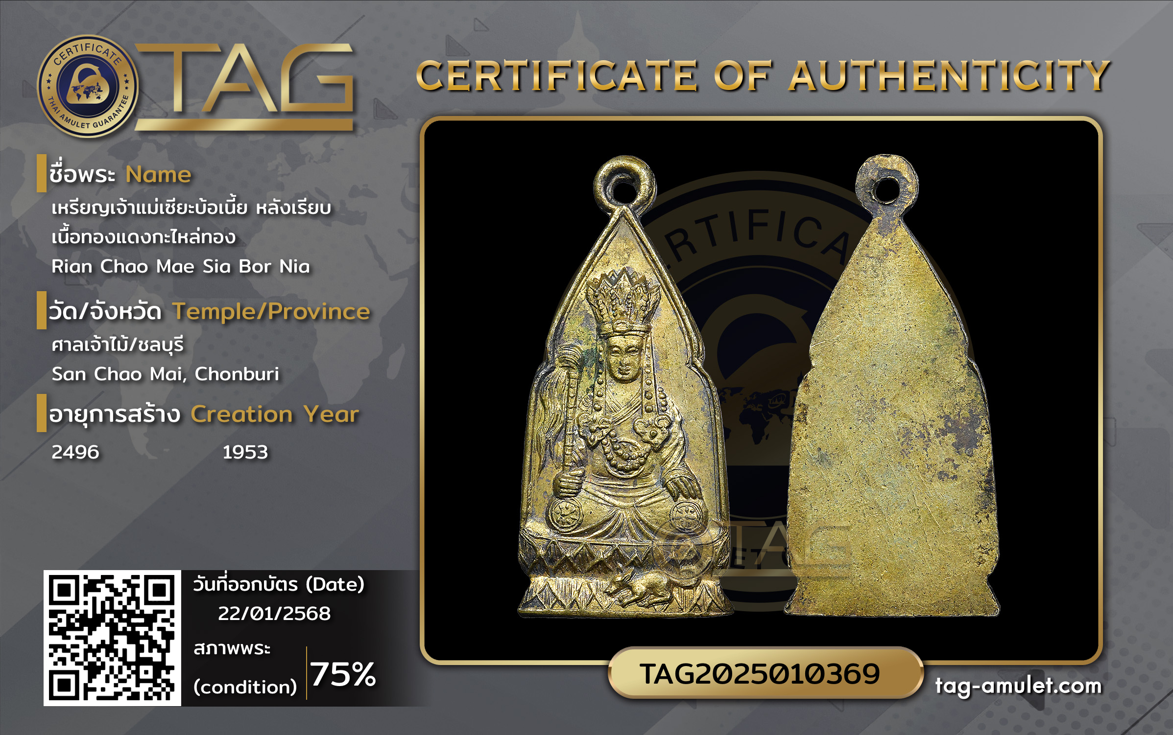 เหรียญเจ้าแม่เซียะบ้อเนี้ย หลังเรียบ เนื้อทองแดงกะไหล่ทอง ศาลเจ้าไม้ จ.ชลบุรี ปี 2496